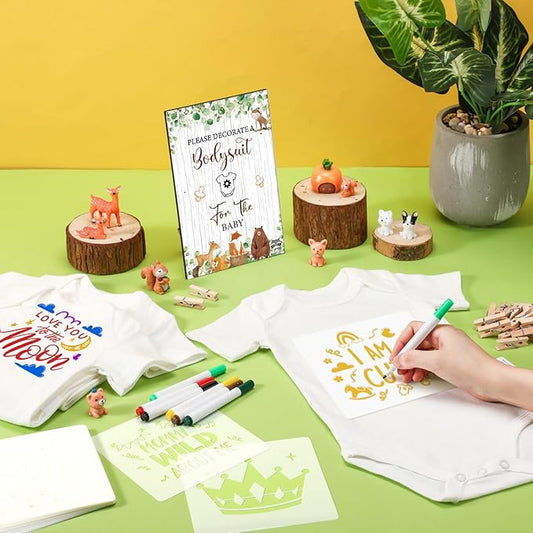 Panitay 126 Pcs Baby Shower DIY Bodysuit Set Rustic Kraft Baby Shower Game Sign DIY Bib 25 Blank White Newborn Bodysuit 25 Stencils 24 Marker 1 Sign 50 Pins for Gender Reveal(Woodland Animals)