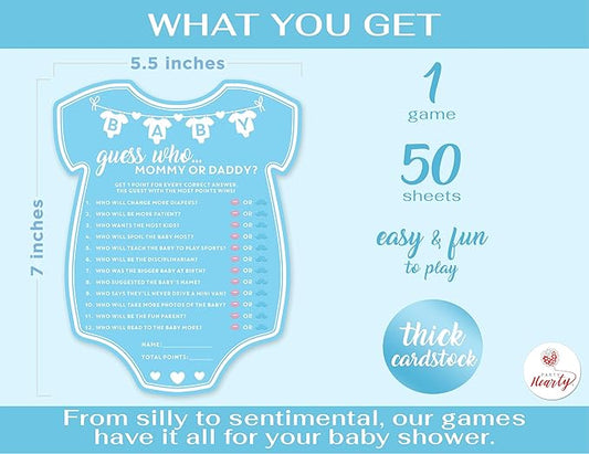 Party Hearty Baby Shower Games for Boy, 50 pcs Blue Mommy or Daddy Guess Who Game, Fun Activity Cards, Baby Shower Ideas