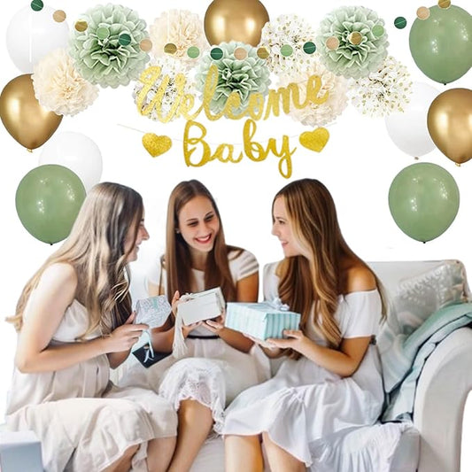 Baby Shower Decorations Neutral Sage Green and Gold Party- Welcome Baby Banner,Balloons,Tissue Pom Poms,Circle Dot & Tassel Garland- Baby Gender Reveal Birthday Woodland Themes Décor