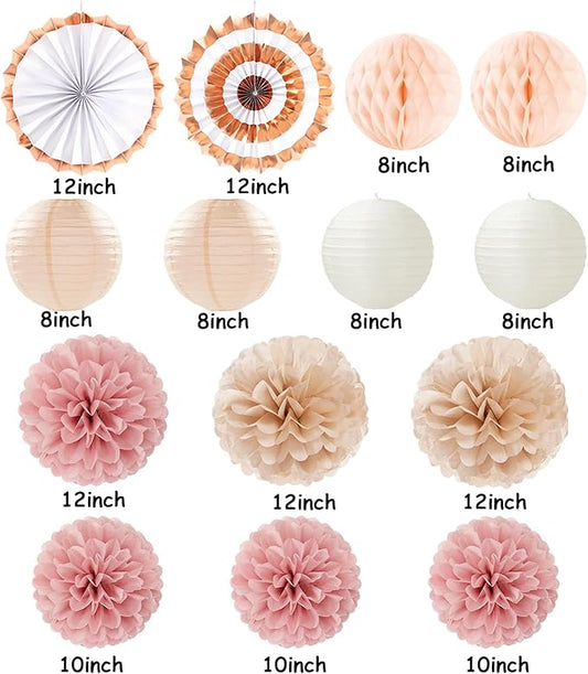 Pink Champagne-Beige Rose-Gold Boho Party-Decorations - 14Pcs Women Girls Birthday Streamers Lanterns Honeycomb Fan,Tissue Pom Poms,Fall Baby Bridal Shower Wedding Backdrop Classroom Decor Ouruola