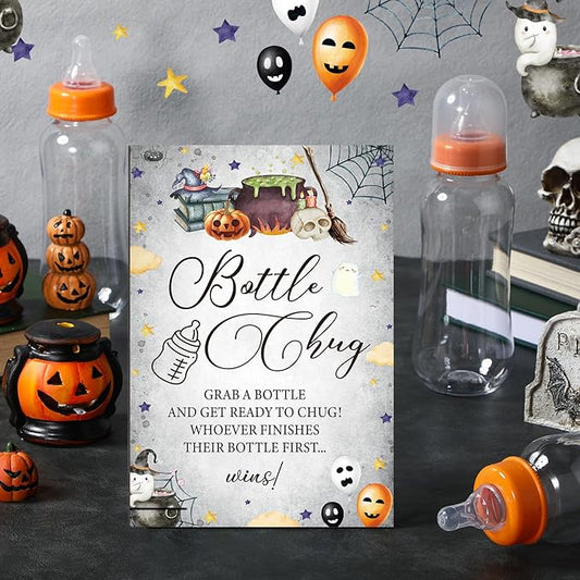 TrelaCo Halloween Cool Baby Shower Games Bottle Chug Sign Wooden Halloween Boo Theme Baby Gift Sets Gender Reveal Party Favors and 12 Pcs Baby Bottle Shower Favor Baby Bottles for Baby Shower