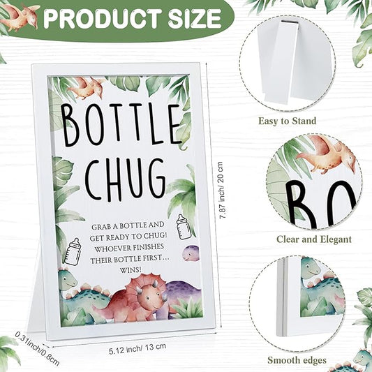 Roowest Bottle Chug Baby Shower Game Favors Including Dinosaur Theme Wooden Sign and 18 Pcs Baby Bottles for Gender Reveal Party Supplies