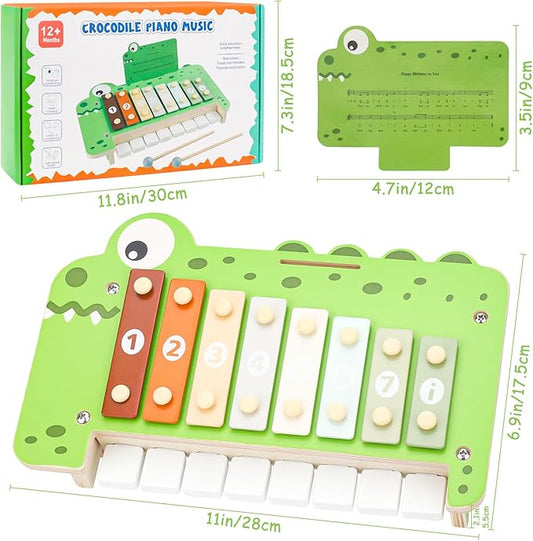 Baby Piano Xylophone Musical Toys - 2 in 1 Wooden Montessori Crocodile Toys for Toddler Kids, 8 Multicolored Key Keyboard Instruments, Preschool Educational Musical Learning Toy for Girls Boys