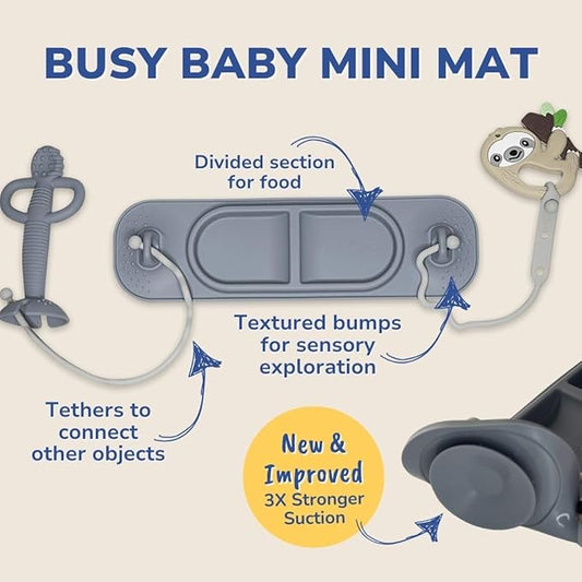 BUSY BABY Silicone Mini Mat - New and Improved Suction Cups, 2 Straps to Secure Baby Essentials, Self Feeding, Baby Led Weaning, Travel Wet Bag Included (Pewter Mini)