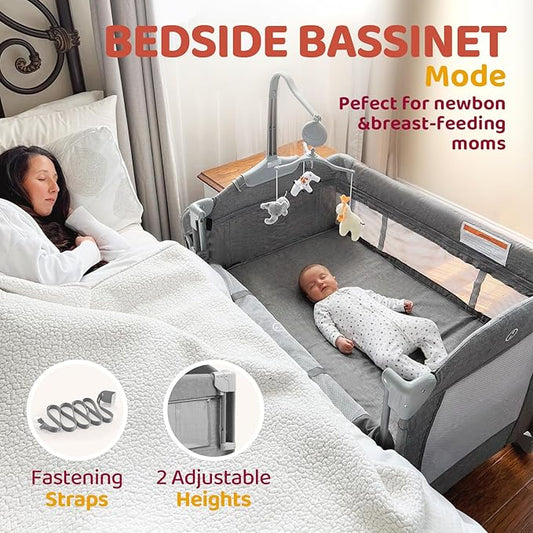 Baby Bassinet, Pack and Play with Bassinet, Bedside Sleeper with Diaper Changer, Mosquito Net, Music Box, Portable Crib with One-Click Installation, Playard for Newborn to Toddlers