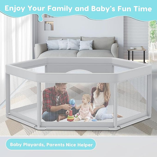 65" ×65" Hexagonal Baby Playpen, Baby Playard for Babies and Toddlers, BabyFence Play Pens for Indoor & Outdoor, Sturdy Safety Play Yard with Soft Breathable Mesh, Anti-Fall, Grey