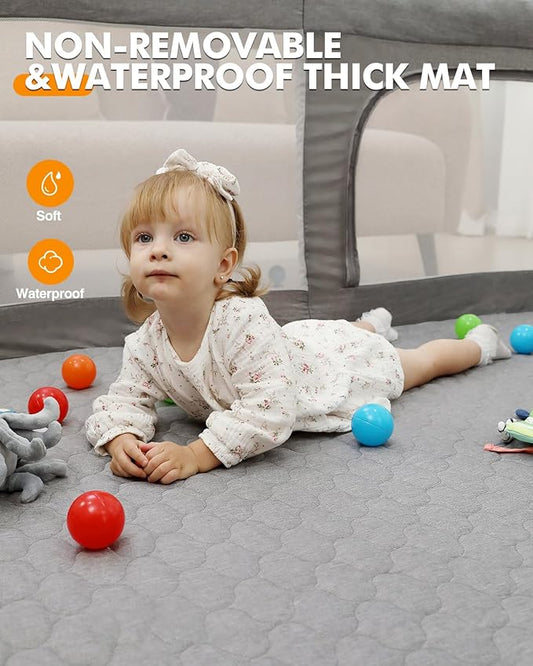 Foldable Baby Playpen with Non-Removable Thick Mat, Extra Large Collapsible Play Yard for Babies & Toddlers, Portable Travel Playpen with Gate, Safe Activity Center (51"×51" Grey)