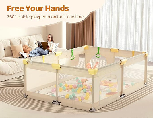 COMOMY Playpens for Babies and Toddlers, 79"x63" Baby Playard Extra Large, Safe and Non-Slip Baby Fence, Full Mesh Design, Indoor & Outdoor Kids Activity Center, Baby Play Pens (Beige)
