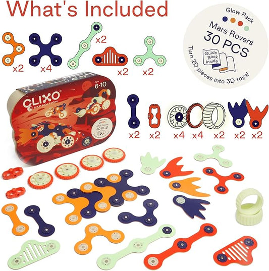 Clixo Mars Rover Pack - Glow-in-The-Dark Wheels Magnetic Building Toy - 30 Flexible Magnet Pieces for Galactic Exploration & Adventure. Award-nominated STEM Toy. Kids Gift & Travel Toy. Ages 6+ [New]