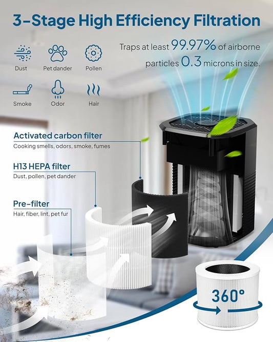 Air Purifiers for Office with H13 True HEPA Filter Up to 1076 Ft² for Pet Family, Pollen, Smoke, Compact Air Cleaner with 3 Speeds, Timer, Aroma Quiet, 360°Intake, for Home Bedroom, Black