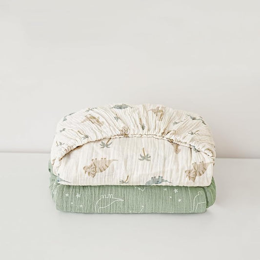 Konssy Muslin Crib Sheets for Boys, Soft Cotton Neutral Baby Sheets for Standard Crib Mattress 2 Pack, 52"x28" (Dino Jungle,Sage Dino)