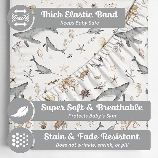 Crib Sheets Neutral - Fitted Baby Crib Sheets Bed for Girl Boy - 2 Pack Standard & Toddler Mattress (Ocean Odyssey) - Buttery Soft Organic Cotton Blend