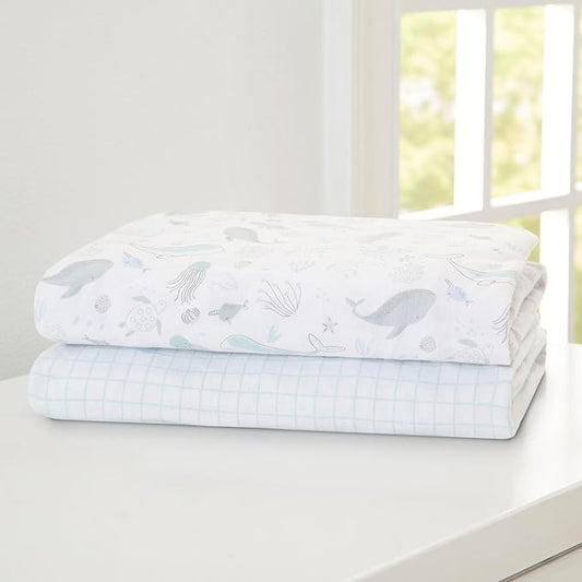 Konssy Muslin Crib Sheets 2 PCS, 100% Cotton Baby Crib Sheets for Standard Crib Mattress (28"x 52"), Soft and Breathable for Boys, Girls (Blue Whale,Blue)
