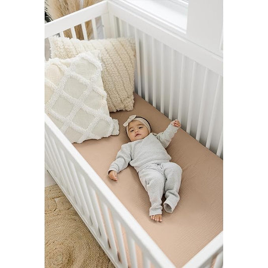 Konssy Muslin Mini Crib Sheets, 100% Soft Cotton Pack and Play Sheets for Pack N Play Mattress, Playard Baby Crib Sheets for Baby Girls(Brown, Cream)