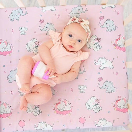 4 Pack Baby Girl Pack N Play Mini Crib Sheets Set Soft Fitted Elephant Theme Baby Girl Mattress Covers Breathable Toddler Bed Sheets for Infant or Newborn(Elephant, Pack N Play Mini Crib Sheets)