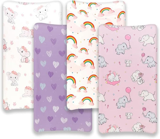 4 Pack Baby Girl Changing Pad Covers Sheets Set Soft Fitted Floral or Elephant Theme Baby Girl Mattress Covers Breathable Toddler Bed Sheets for Infant or Newborn Girls (Elephant, Changing Pad Covers)