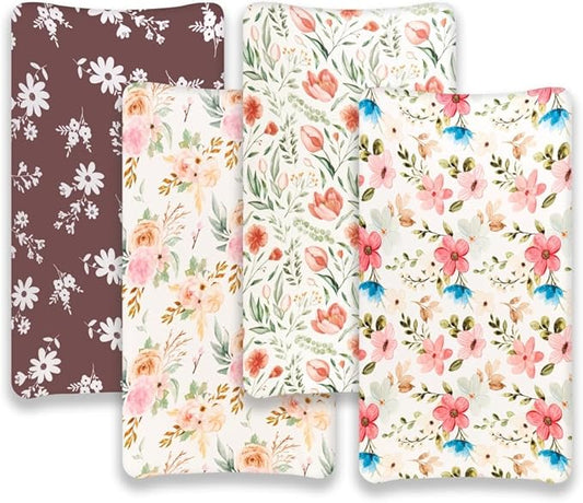 4 Pack Baby Girl Changing Pad Covers Sheets Set Soft Fitted Floral or Elephant Theme Baby Girl Mattress Covers Breathable Toddler Bed Sheets for Infant or Newborn Girls (Flower, Changing Pad Covers)