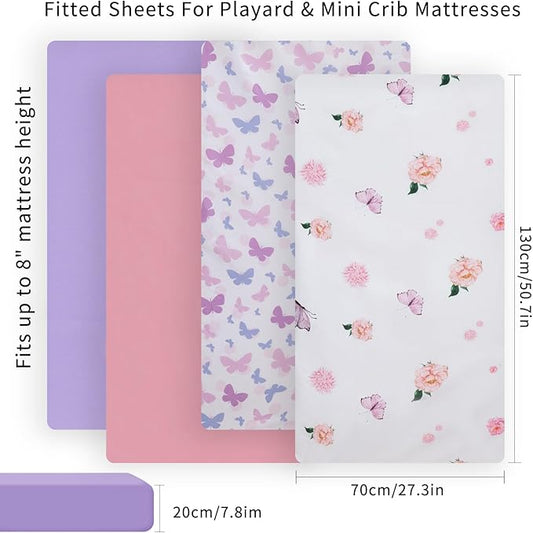 Crib Sheet for Boys and Girls, Super Soft Microfibre Crib Sheet Set, Breathable Cot Sheet, for Cot and Toddler Mattress, 130x70x20cm, Butterfly and Flower and Pink and Purple,4pcs