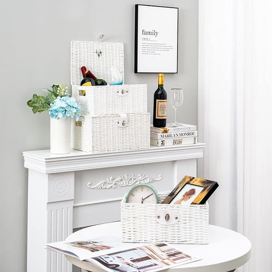 Set of 3 Woven Wicker Storage Basket Box with Lid & Lock, Built-in Carry Handles, Multifunctional Storage Organiser for Nursery, Baby, Clothes, Toys, Books, Large/Medium/Small Size (White)