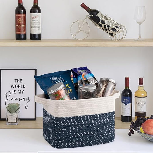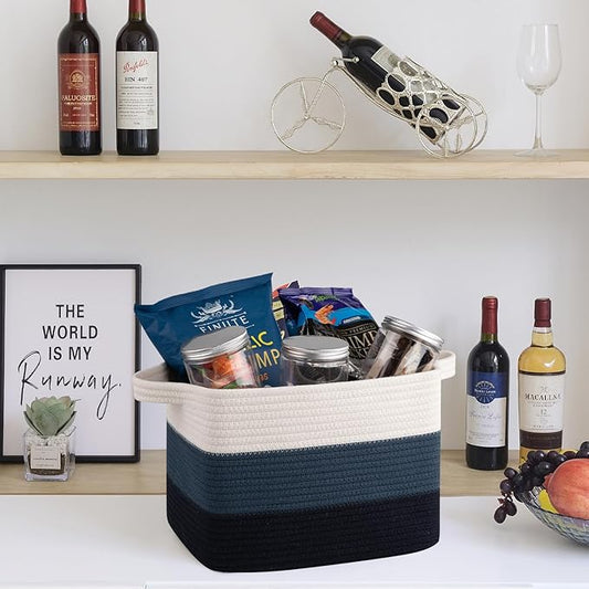 OIAHOMY Storage Baskets - Woven Cotton Rope Baskets for Shelves, Toy Towel Organizer Bins, Pack of 3, Blue & White