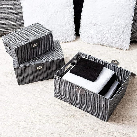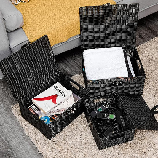 Set of 3 Woven Storage Basket Box Wicker Hamper Stackable Bin with Lid & Lock, Built-in Carry Handles, Organizer for Nursery, Baby Closet, Diaper, Toys, Home, Office, Laundry, DVD (Black)