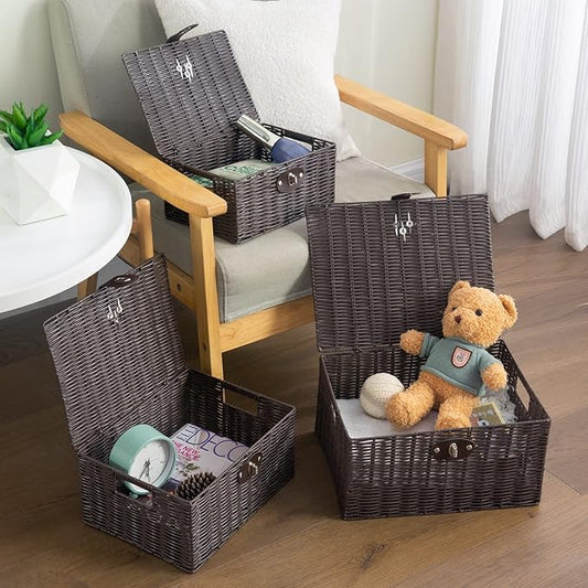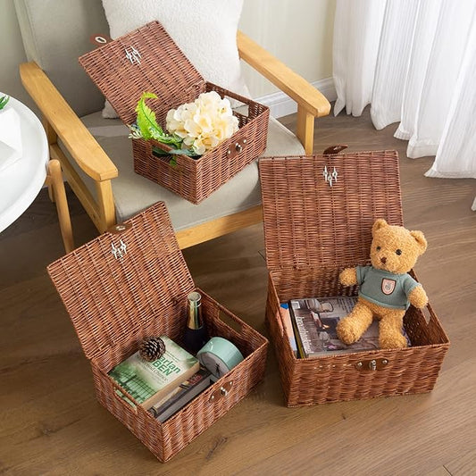 Set of 3 Woven Wicker Storage Basket Box with Lid & Lock, Built-in Carry Handles, Multifunctional Storage Organiser for Nursery, Baby, Clothes, Toys, Books, Large/Medium/Small Size (Brown)