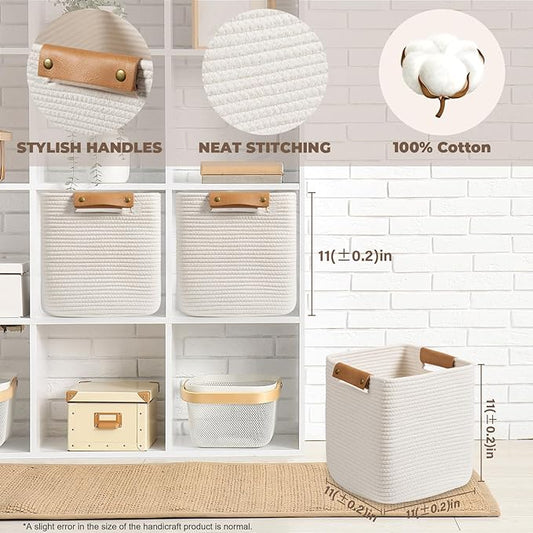 danpinera Set of 3 11 Inch Storage Baskets, Cube Storage Bins, White Woven Baskets with Stable Leather Handles, Square Cotton Rope Bins for any Room, Easy to Recover