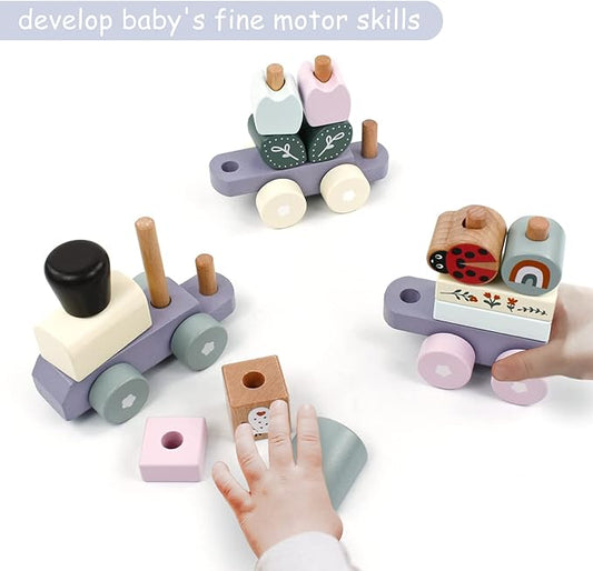 Wooden Stacking Train Toy Set,Wooden Building Blocks Train with Shape Sorter Early Learning Gift for Toddlers Boys Girls 12 Months and up