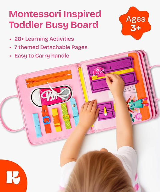 Busy Board for 1 Year Old Sensory Toys for Toddlers 1-3 Montessori Learning Busy Book for Boys Girls Preschool Toys Gift (Pink)