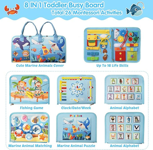 Busy Board Montessori Toys for 1 2 3 4 Year Old Boys & Girls Birthday Gifts, Toddlers Sensory Educational Travel Activities Busy Book with Fishing Game & Alphabet Puzzle & Fine Motor Skills