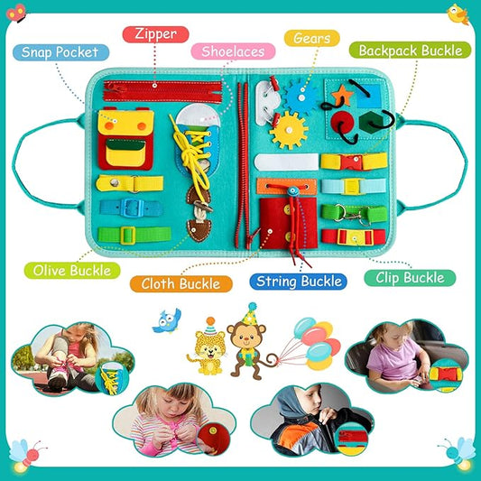 Busy Board Montessori Toys for 1 2 3 4 Year Old Boys & Girls Sensory Learning Activities Game with Alphabet Spelling & Toddler Kids Travel Busy Book & Birthday Gifts & Fine Dress Motor Skill