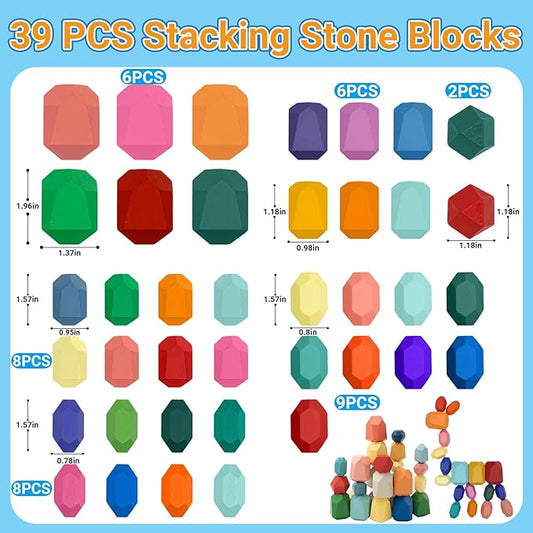 39PCS Montessori Wooden Stacking Rocks Toys Colorful Stacking Stones Building Blocks Games Sensory Toy for Toddlers Educational Learning Toys for 1 2 3 4 5 6 Years Old Kids