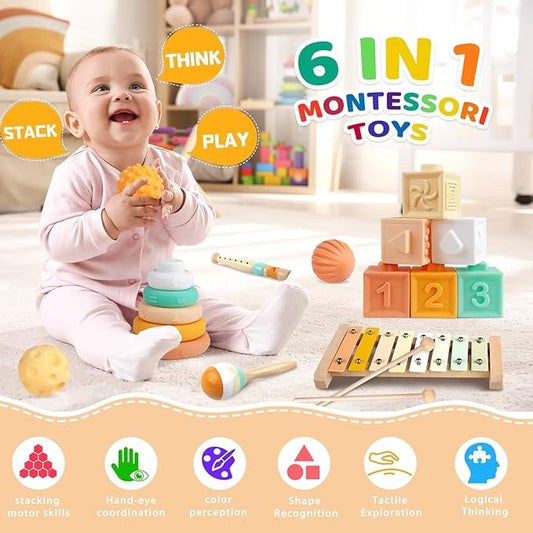 Montessori Toys for 6 Month Old 1+ Year Old 6 in 1 Musical Instruments for Toddler Stacking Blocks Rings Development Learning Educational Toy with Wooden Xylophone for 6 7 8 9 Months 1 Year Old Baby