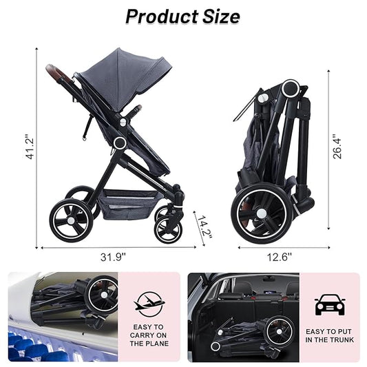 Tinyiota Baby Stroller, Infant Stroller with Large UPF 50+ Canopy,Luxury Pram Strollers with Leather Handle & Spacious Seat, One-Hand Foldable Pushchair, Toddler Carriage with Lie-Flat Mode(Gray)