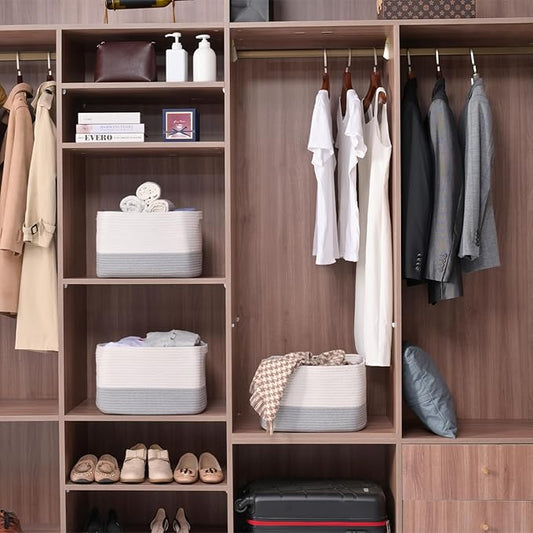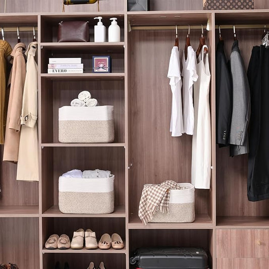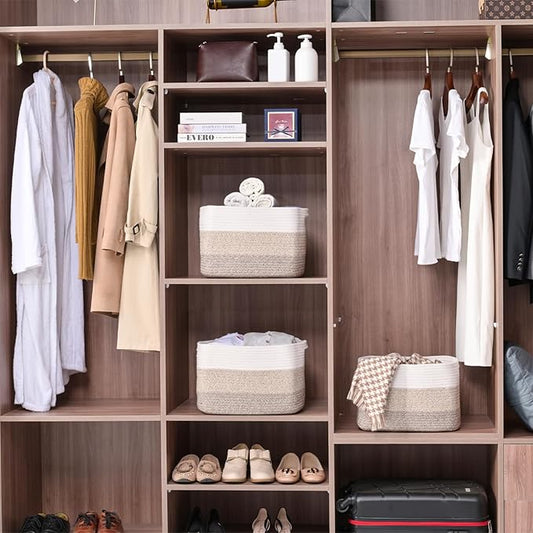 COMFY-HOMI 2 pcs Large Storage Baskets for Shelves, Laundry Basket, Woven Rope Basket, Closet Organizer Bins for Clothes Blanket Towels, Baby Nursery, Gift Toy Baskets, 17” x 13” x 7.5”-White/3 Brown
