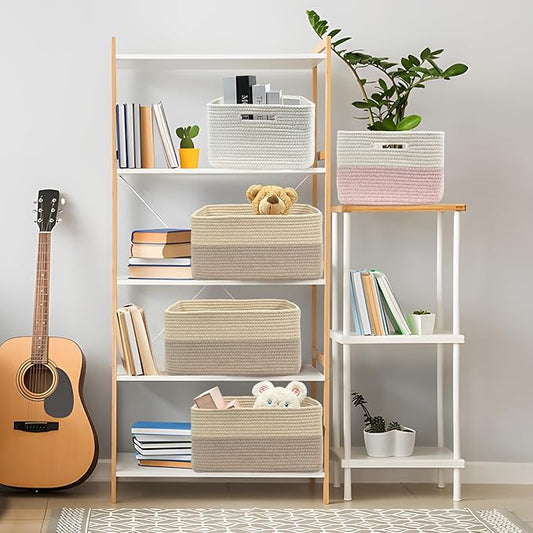 COMFY-HOMI 3 pcs Large Storage Baskets for Shelves, Laundry Basket, Woven Rope Basket, Closet Organizer Bins for Clothes Blanket Towels, Baby Nursery, Gift Toy Baskets, 17” x 13” x 7.5”-White/Pink