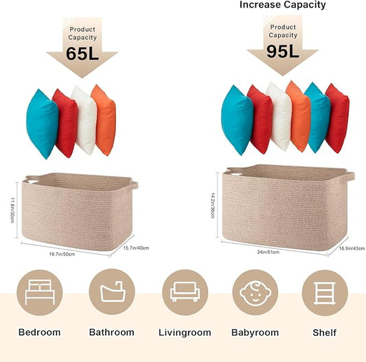 95L Large Storage Basket, Cotton Rope Woven Blanket Basket, Toy Storage for Baby Room, Living Room, 24" x 16.9" x 14.2", White