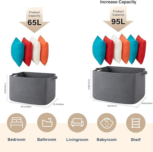 95L Large Storage Basket, Cotton Rope Woven Blanket Basket, Nursery Storage for Baby Room, Living Room, 24" x 16.9" x 14.2", Light Grey