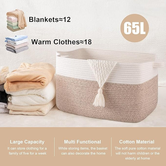 65L Large Storage Basket, Cotton Rope Woven Blanket Basket, Toy Storage for Baby Room, Living Room, Brown & White
