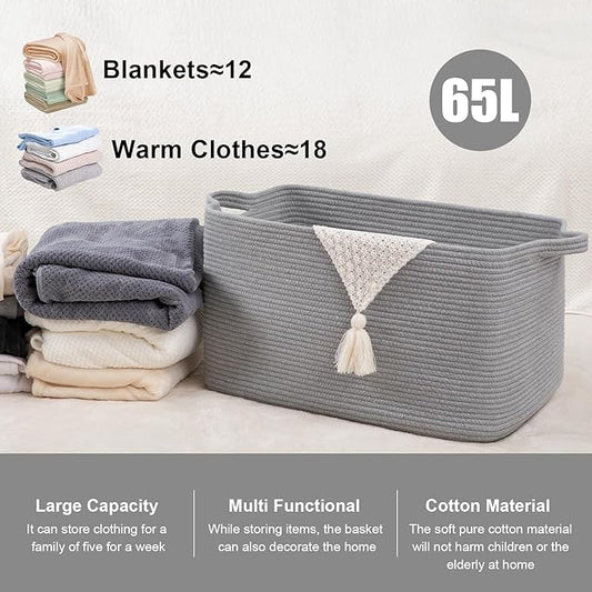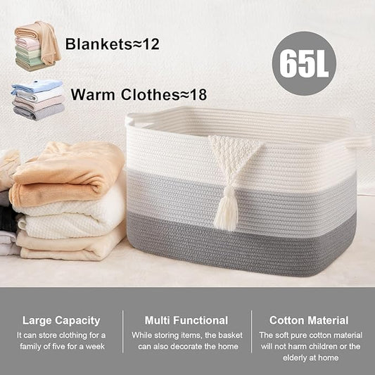 65L Large Storage Basket, Cotton Rope Woven Blanket Basket, Toy Storage for Baby Room, Living Room, Gradient Grey