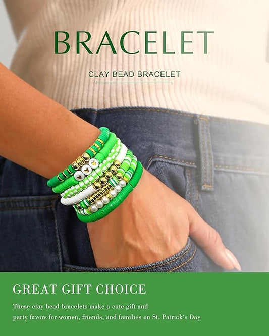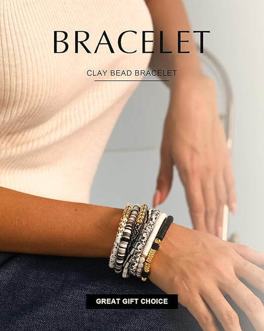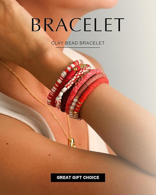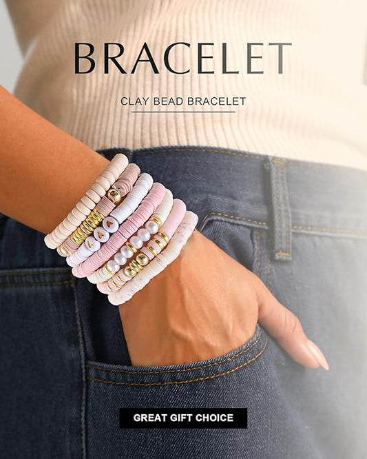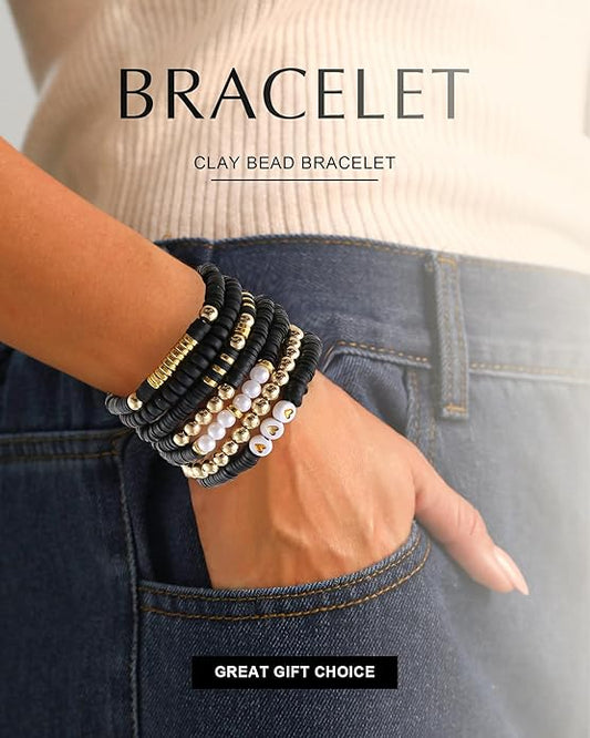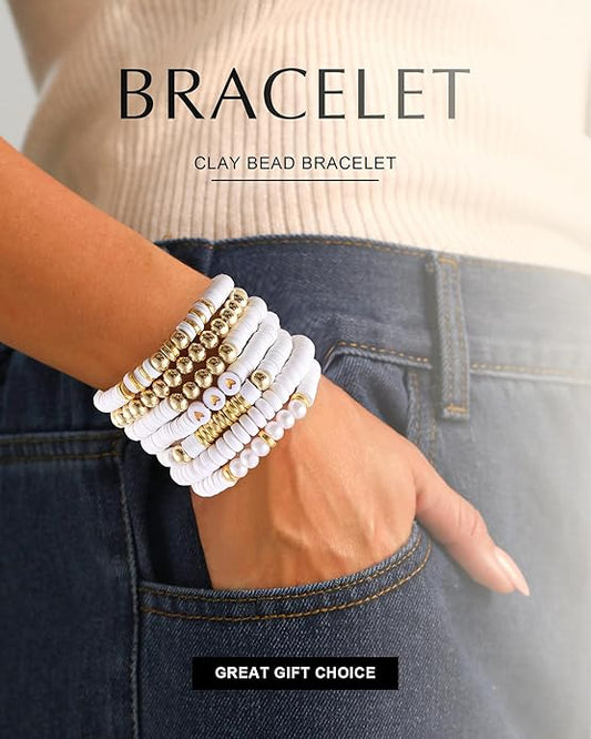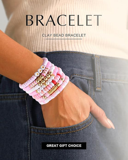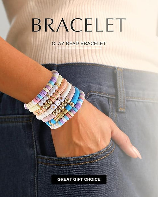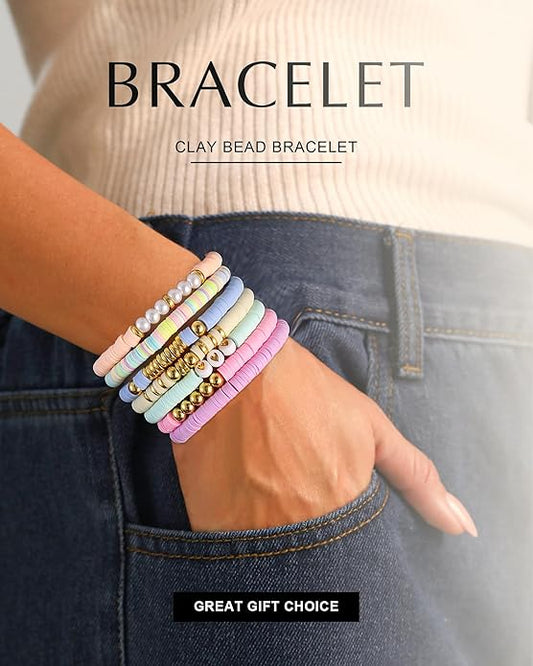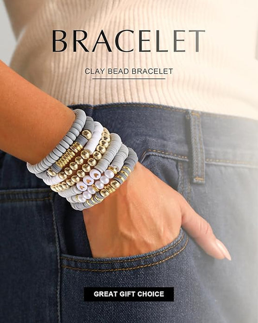 Friendship Bracelets Trendy Heishi Clay Bead Bracelets Stack Gold Beaded Stretch Bracelets for Women Boho Stackable Bracelets Bulk Cute Preppy Jewelry