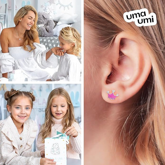 925 Sterling Silver Crown Pink Stud Earrings for Girls Hypoallergenic Safety Screw Back Rhodium Plated - Crown Pink Gifts Earrings for Baby Toddlers Little Teens Kids Jewelry