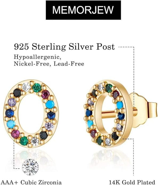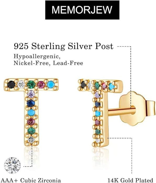 Memorjew Initial Stud Earrings for Women, Hypoallergenic 925 Sterling Silver Post Rainbow Cubic Zirconia Gold Plated 26 Initial Earrings for Women Jewelry Gifts