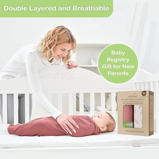 Organic Cotton Muslin Baby Blanket - 47x47 Inch Breathable Swaddle, Hypoallergenic Double-Layer, Versatile Use (Pink Floral, 47x47 Inch)