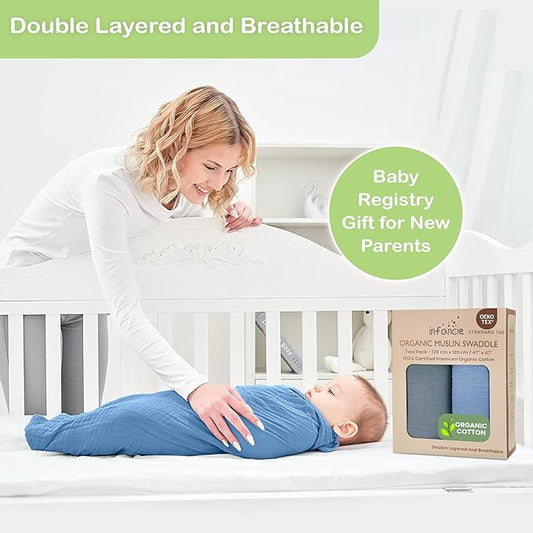 Organic Cotton Muslin Baby Blanket - 47x47 Inch Breathable Swaddle, Hypoallergenic Double-Layer, Versatile Use (Slate/Aquarius, 47x47 Inch)