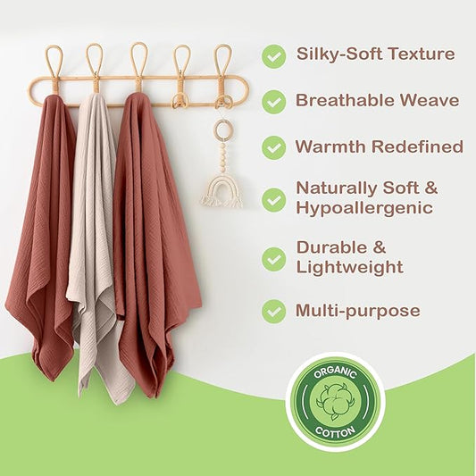 Organic Cotton Muslin Baby Blanket - 47x47 Inch Breathable Swaddle, Hypoallergenic Double-Layer, Versatile Use (Rust/Ivory, 47x47 Inch)
