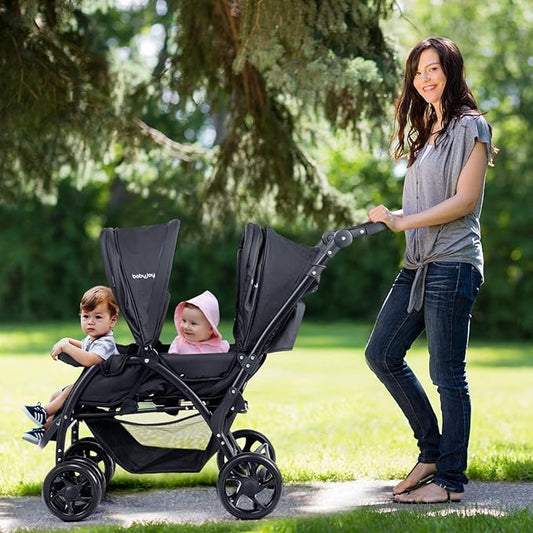 BABY JOY Double Stroller, Foldable Lightweight Twin Stroller with Tandem Seating, Adjustable Backrest/Canopy/Footrest, 5-Point Harness, Storage Basket, Newborn and Toddler (Black)