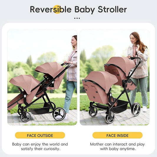 MU Double Stroller, Foldable Twin Tandem Stroller with Adjustable Backrest, Reversible Seat, 5-Point Harness, Storage Basket, Convertible Baby Bassinet for Infant and Toddler, Pink