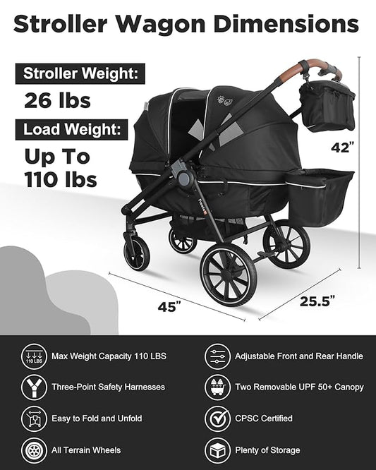 Tandem Wagon Stroller–All-Terrain 2-in-1 Push&Pull Design, Double Seat, Large Storage, Adjustable Canopy, Removable Child Tray for Kids Outdoor Adventures&Family Outings