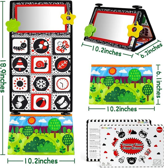 Dr.Rapeti Tummy Time Floor Mirror for Baby Infant Toddler Kids Black and White High Contrast Baby Toy with Crinkle Cloth Book Teethers Floor Activity Toy Washable Non-Toxic